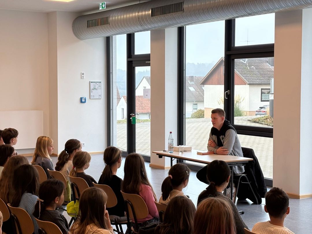 Gebannt lauschten die Kinder den beiden Vorlesern und tauchten ganz in die Welt der Bücher ein. Anschließend durften sie viele Fragen stellen – nicht nur zu den Geschichten, sondern auch zum Leben als Profihandballer. Geduldig und mit viel Humor erzählten Felix und Tyler von ihrem Trainingsalltag, spannenden Spielen und ihren Erlebnissen als Teammitglieder der Wölfe Würzburg.