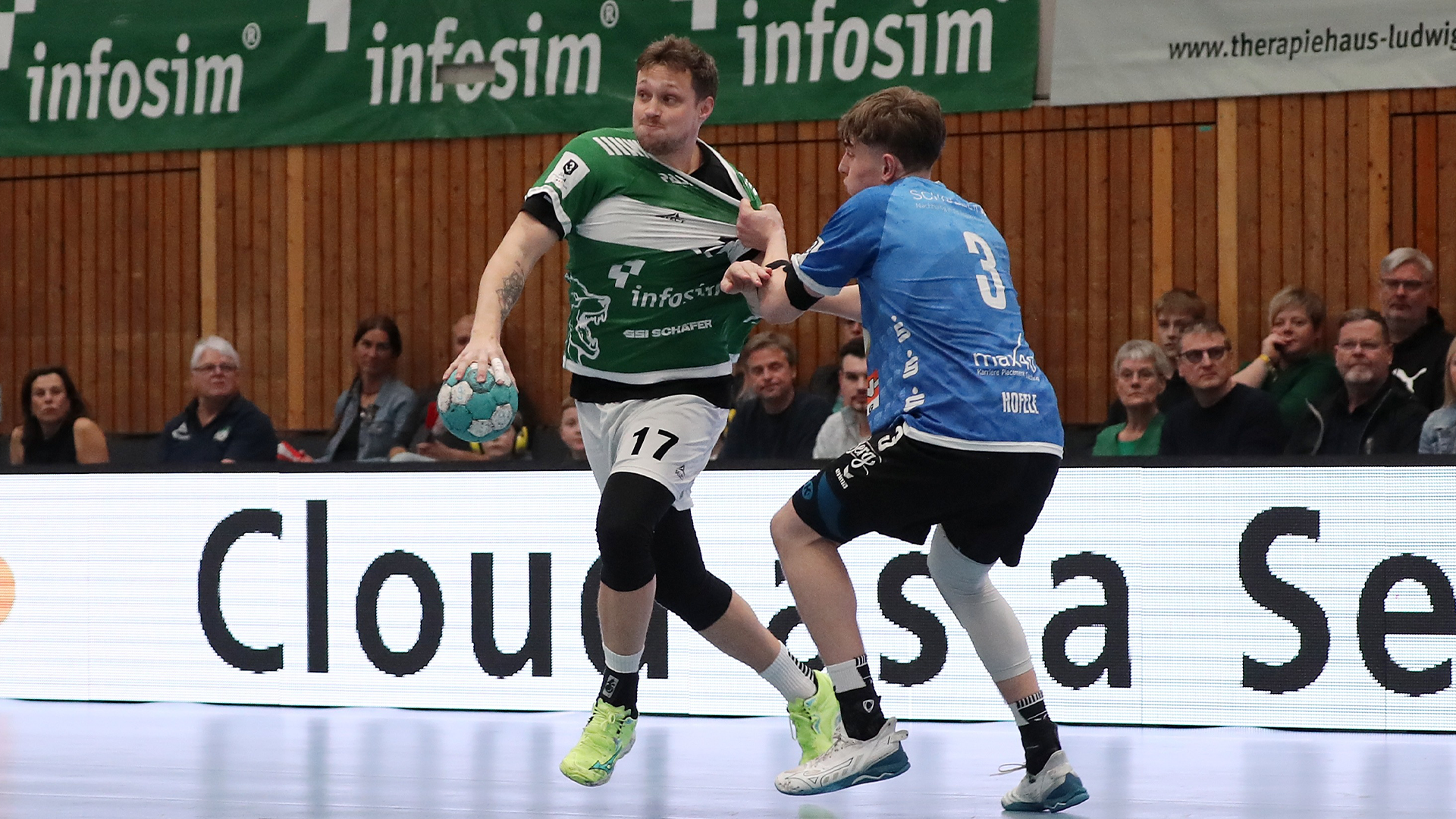 Während draußen, auf den Straßen Würzburg Partystimmung herrschte, trafen die Wölfe in der heimischen tectake Arena auf Ihren Verfolger aus Pfullingen. Gerade in der ersten Halbzeit merkte man den Karrer-Schützlingen aber die Belastung der englischen Woche an. Viele technische Fehler, Unkonzentriertheiten und Fehlwürfe prägten das Bild der ersten 30 Minuten. Zumindest die Abwehr, um den erneut stark parierenden Moritz Ebert, stand sattelfest und so entwickelte sich ein sehr torarme Partie, in der die Gäste erstmal die Nase vorne hatten. 3:5 (12.) Angetrieben von knapp 1000 Zuschauern, die den Weg trotz des gleichzeitig stattfindenden Faschingszugs in die Arena gefunden hatten, bissen sich die Wölfe aber nun rein in das Spiel, und gingen mit einem 3:0-Lauf, durch Michel Reitemann, Jona Reidegeld und Patrick Schmidt, wieder in Führung. 6:5 (19.) Spätestens als nach einer Auszeit der Gäste, Oliver Nielsen auf 7:5 erhöhte, dachte man die Wölfe seien jetzt angekommen in der Partie.