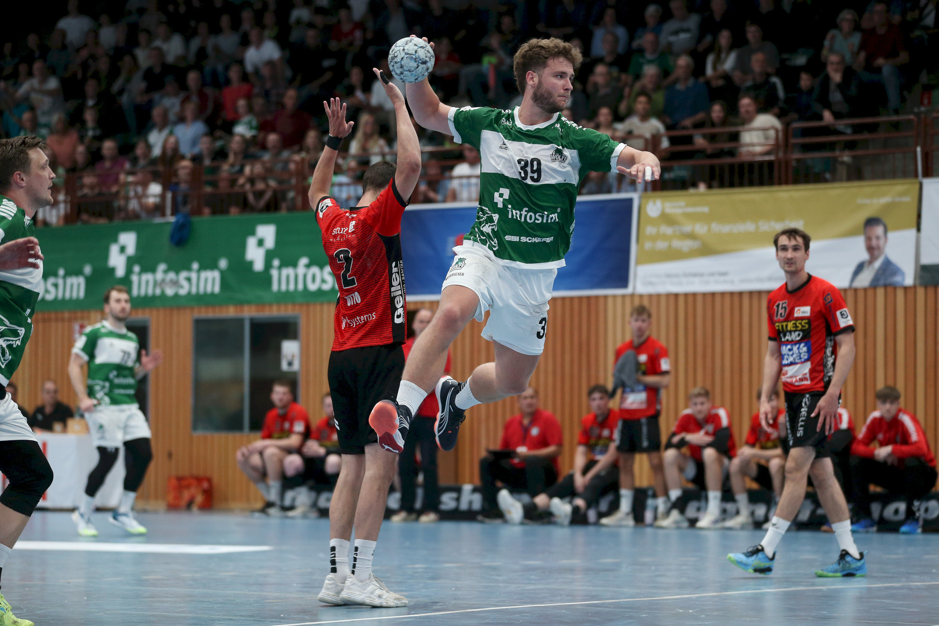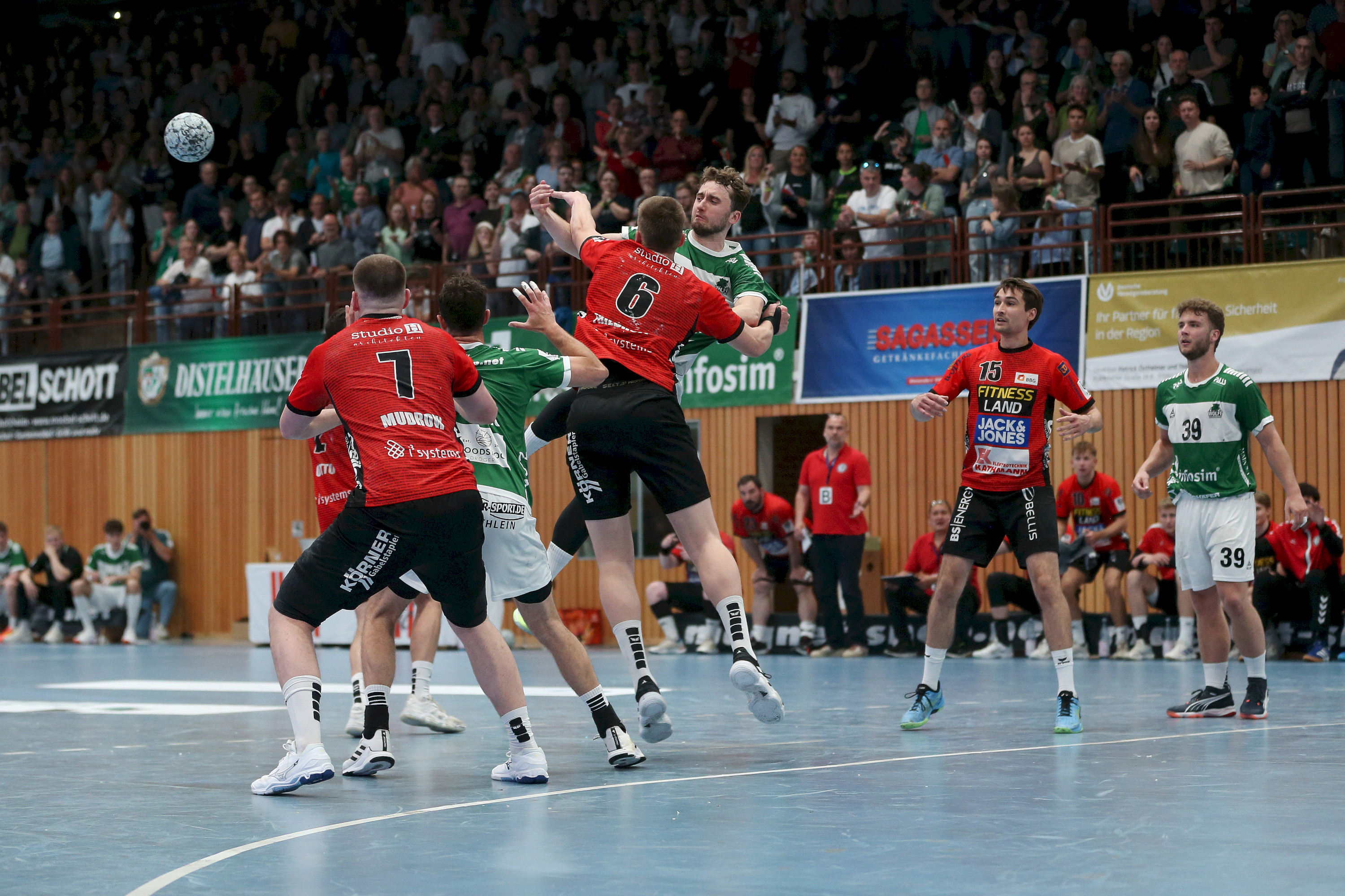 Auch den Auftakt in den zweiten Durchgang machten die Gäste. Bela Pieles schraubte mit seinem Wurf von Linksaußen die Führung auf achte Tore an. Kurze Zeit später sah Trainer-Sohn Jan Mudrow seine erste Zeitstrafe im Spiel, und es sollte der Startschuss sein, für eine unfassbare Aufholjagd der Wölfe. Die Mannschaft um Captain Patrick Schmidt entschieden die Überzahl mit 3:0 für sich und entfachten damit nicht nur die Halle zu einem Hexenkessel, sondern auch den Glauben an sich selbst. Moritz Ebert, der im ersten Durchgang nur wenig zu halten bekam, war nun voll im Spiel und sammelte eine Parade nach der anderen, die seine Vordermänner nun ausnutzten, um weiter Boden gutzumachen. Spätestens als Michel Reitemann und Florian Schmidt, trotz Unterzahl das erste Mal wieder auf nur noch drei Tore verkürzten, hielt es in der Halle niemanden mehr auf den Sitzen und man glaubte daran, das Spiel drehen zu können! 22:25 (40.) Doch die Gäste behielten noch einen ruhigen Kopf und fanden mit Hilfe des siebten Feldspielers weiterhin Lösungen. Nachdem allerdings Alexander Merk und Moritz Ebert kurz hintereinander wieder erfolgreich auf das leere Gäste-Tore warfen, hatte Volker Mudrow genug und nahm bereits seine zweite Auszeit im zweiten Durchgang. 27:30 (49.)